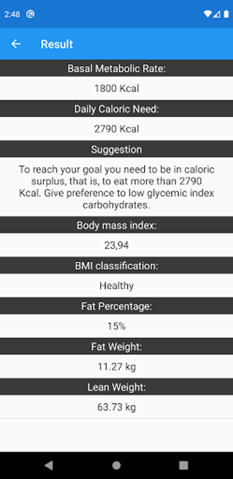 该应用具有简单直观的设计,允许用户输入年龄、性别、身高、体重和活动水平以计算他们的基础代谢率。此外,该应用还提供有关用户BMI和体脂率的有用信息,使他们能够监控整体健康和健身状况。